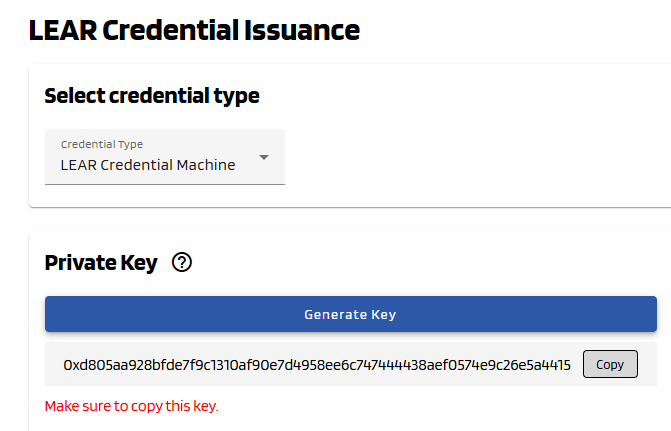 - Private key > This is the key generated during the LEAR Credential Machine issuance process . It is important to save it, as we will need it later.