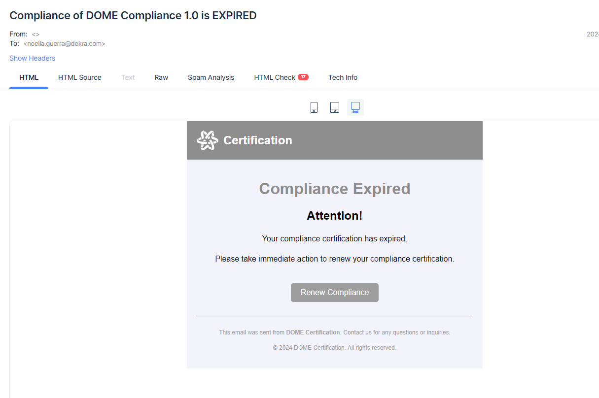 The certification can be renewed at any time, uploading a new VC validated by the DOME Trust Service Provider. If the certification is not re-newed by uploading a new VC the compliance profile will be automatically updated in the DOME platform. The service owner will get a notification about the new compliance level achieved by the service and this information will be updated in the Compliance Profile.
