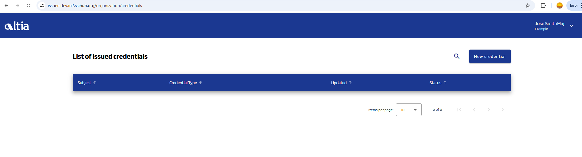 • In the initial view you can see all the issued credentials by the current user/organization: