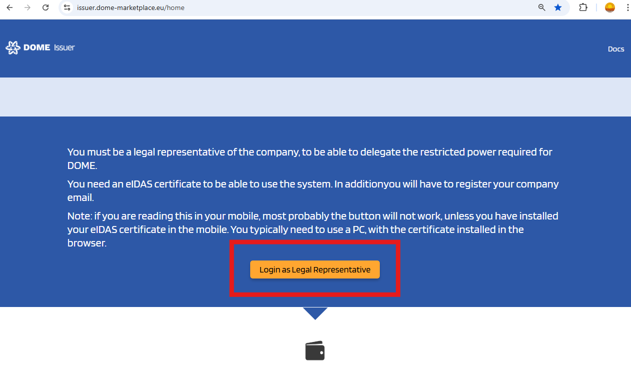 To log in to the DOME Issuer, a credential with “Onboarding – Execute” power is required.