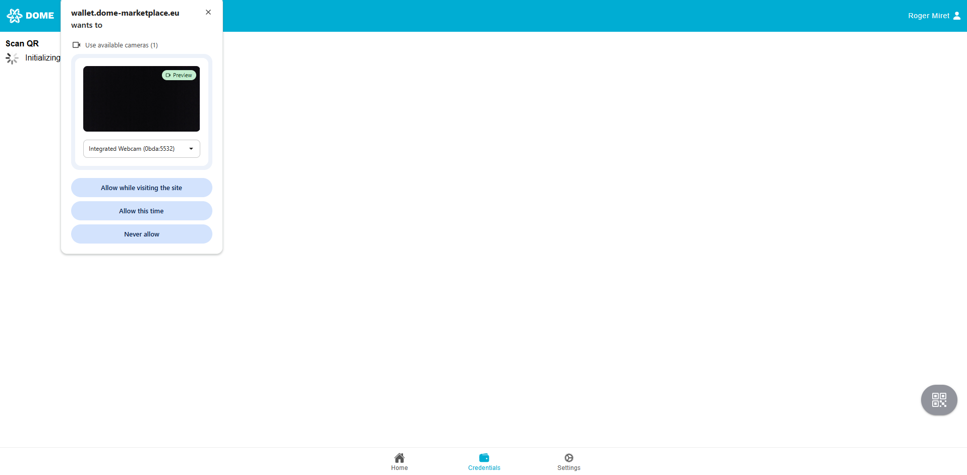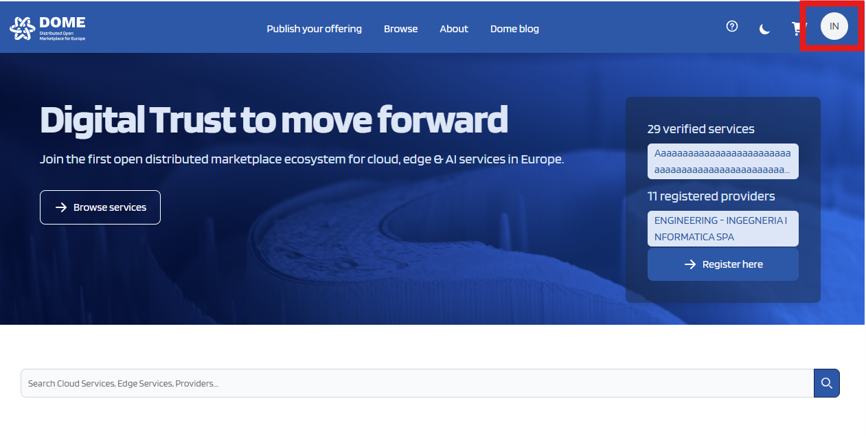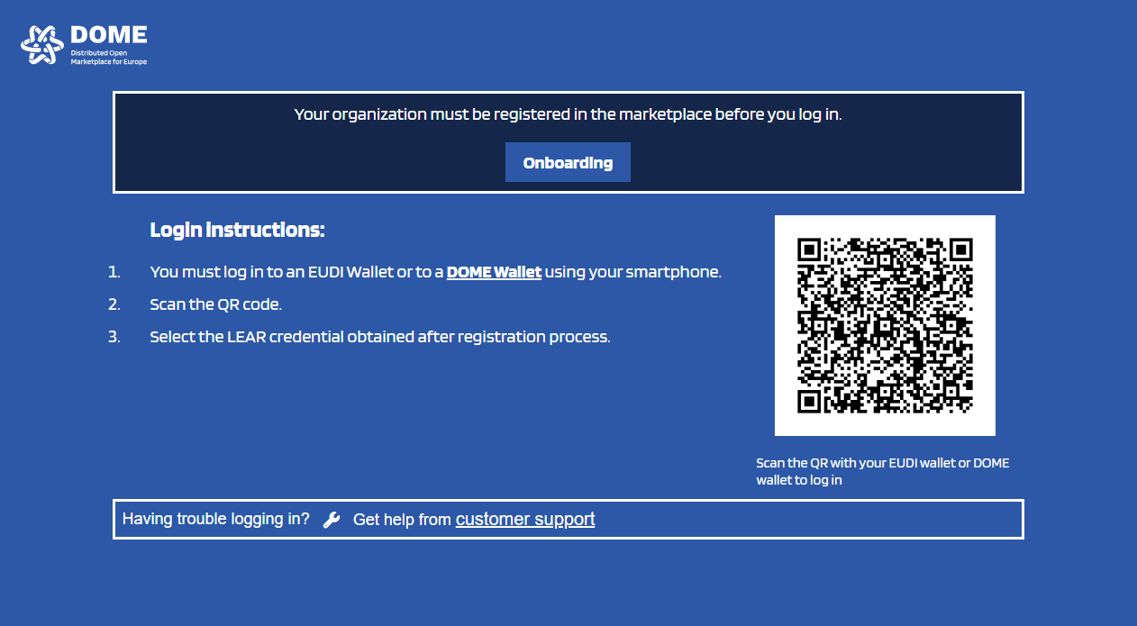 To log in to the DOME Marketplace, you can use a credential with either “Onboarding – Execute” or “ProductOffering” power.