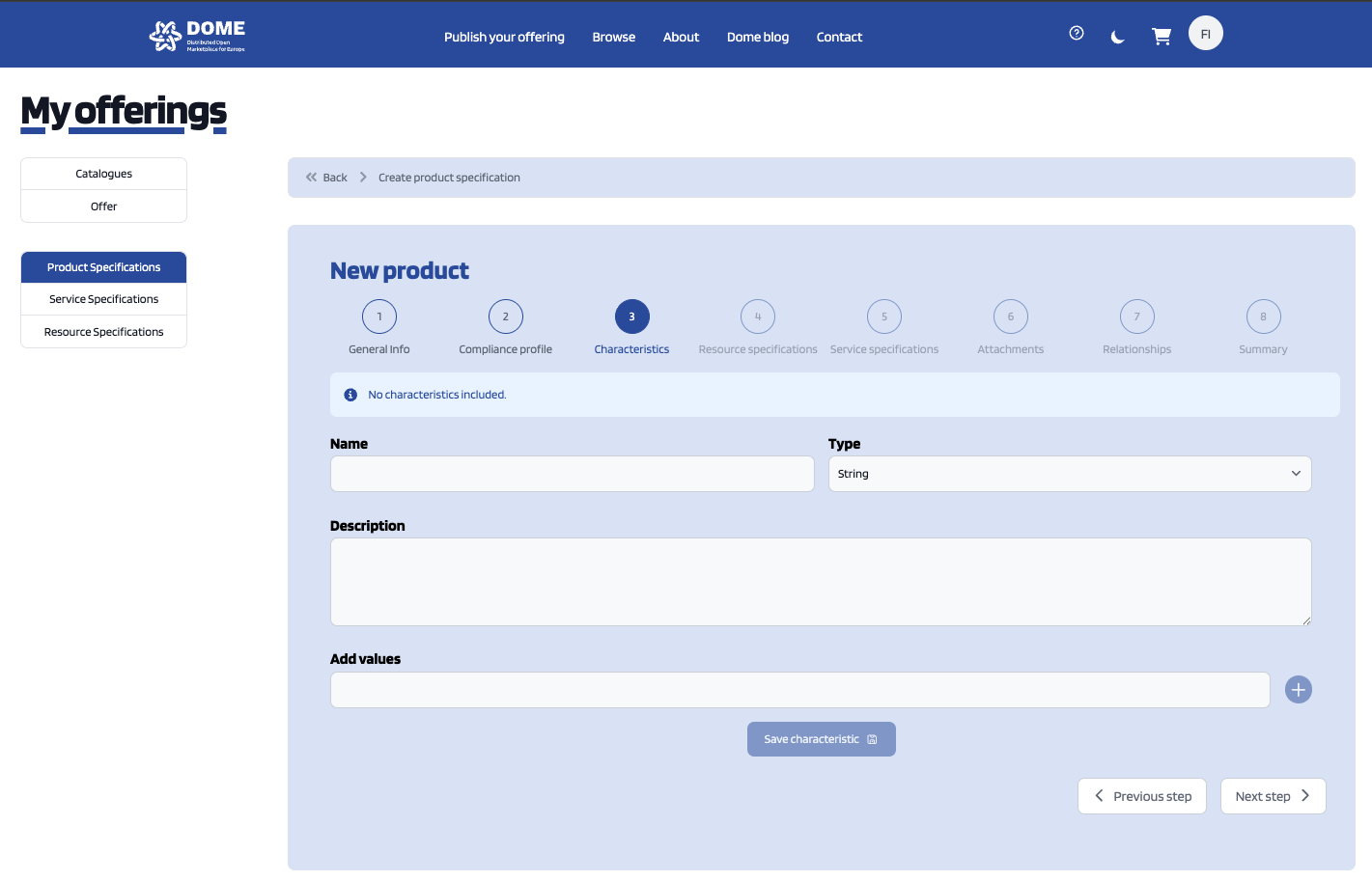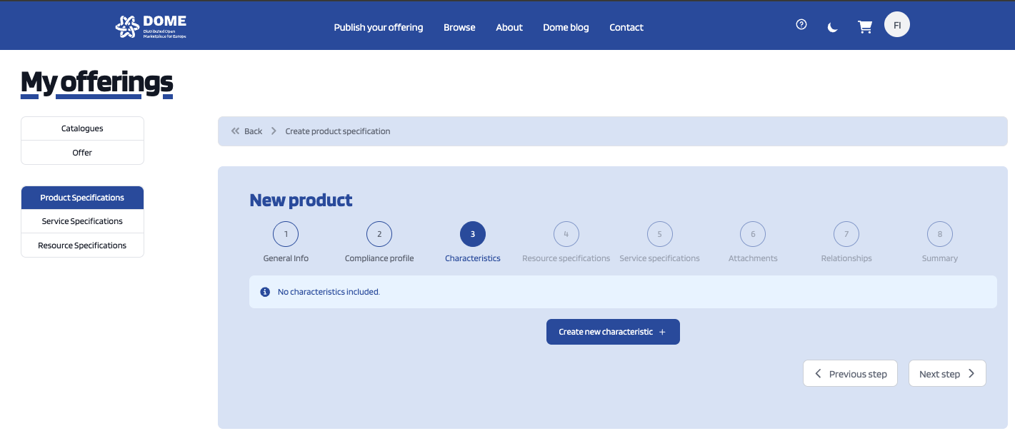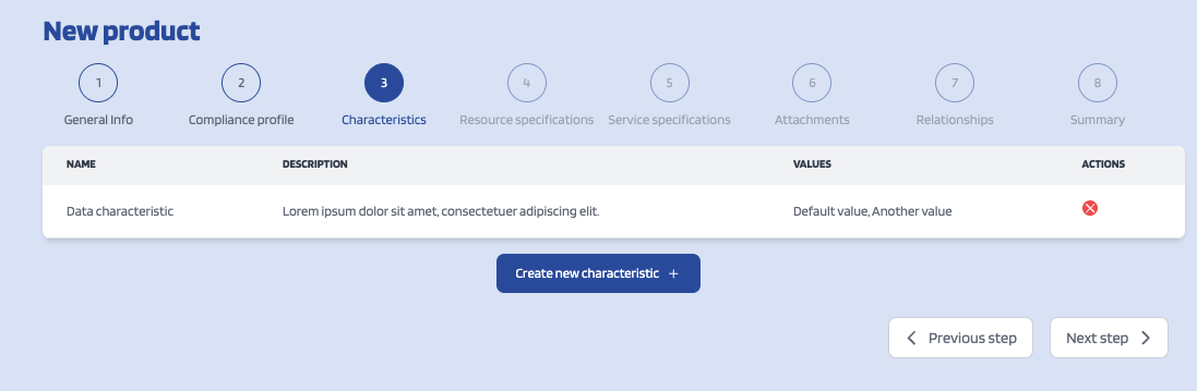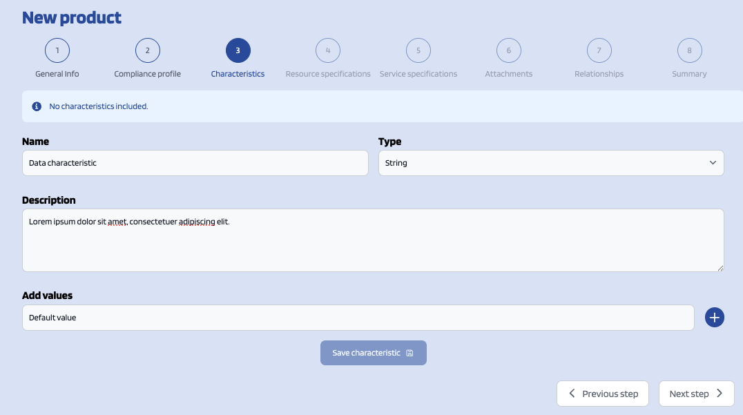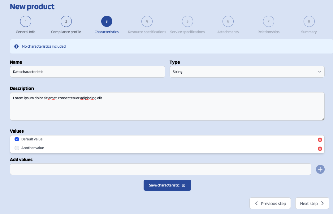 The next step in the creation of a product is including its characteristics. For including a new characteristic click on Create new characteristic and a creation form will be displayed.