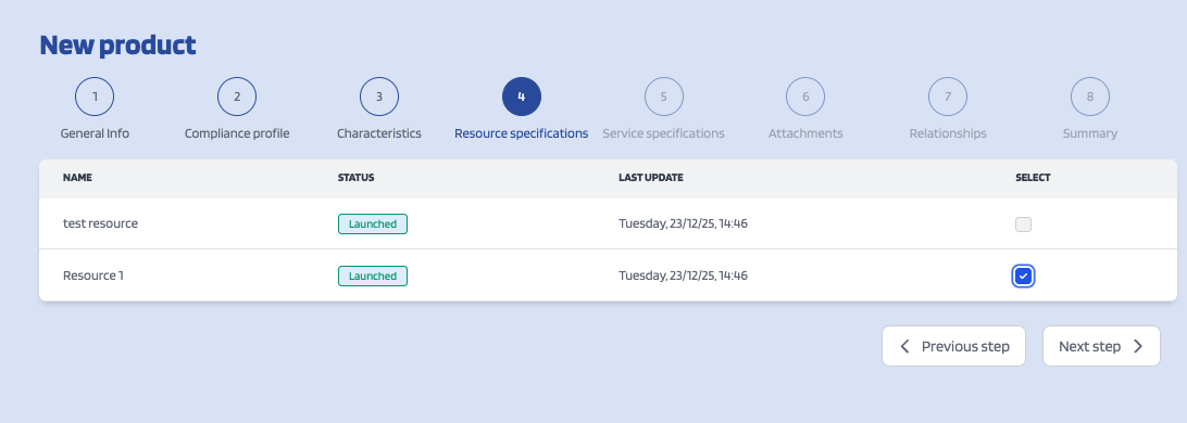 In the next step you can add as many resources as you want to the product by clicking on the check button next to them and then click Next.