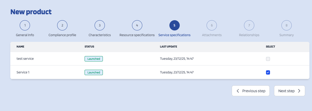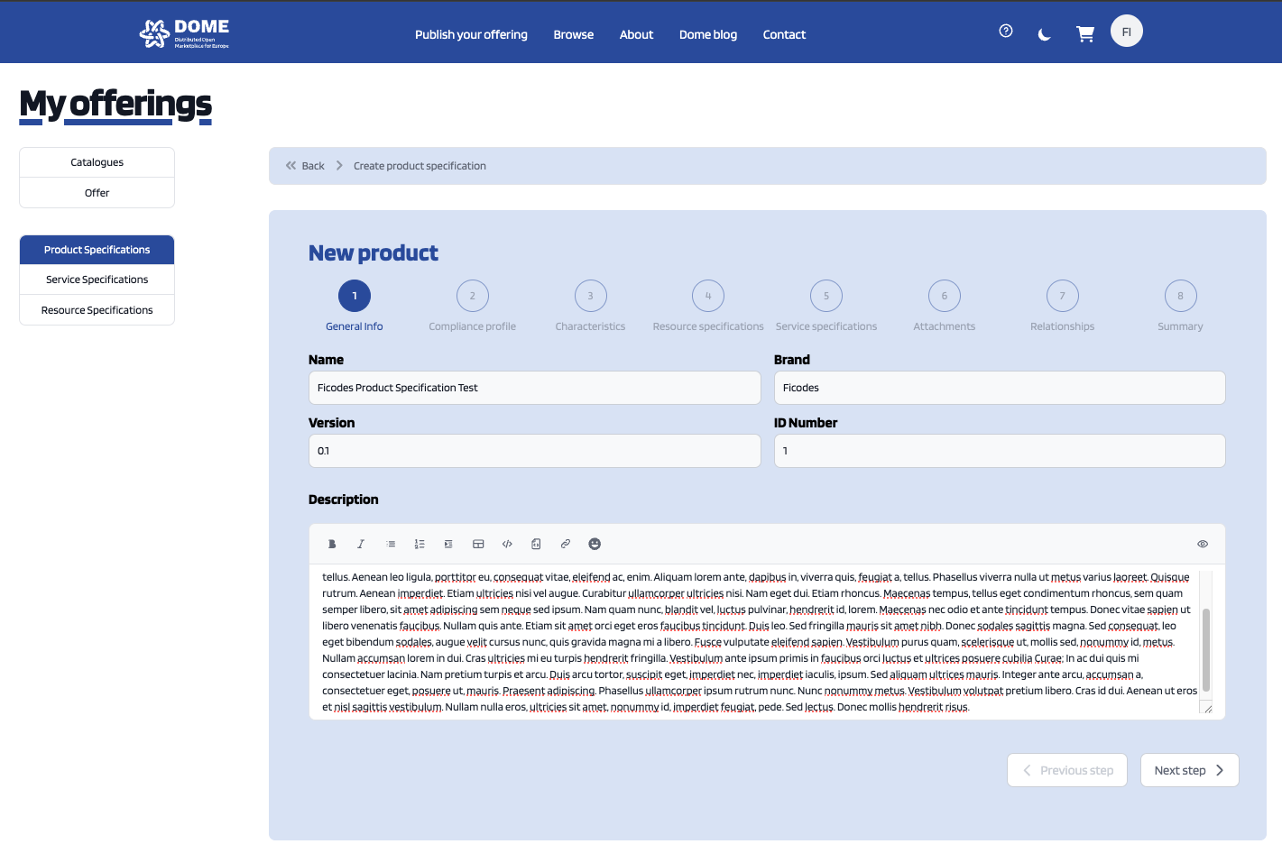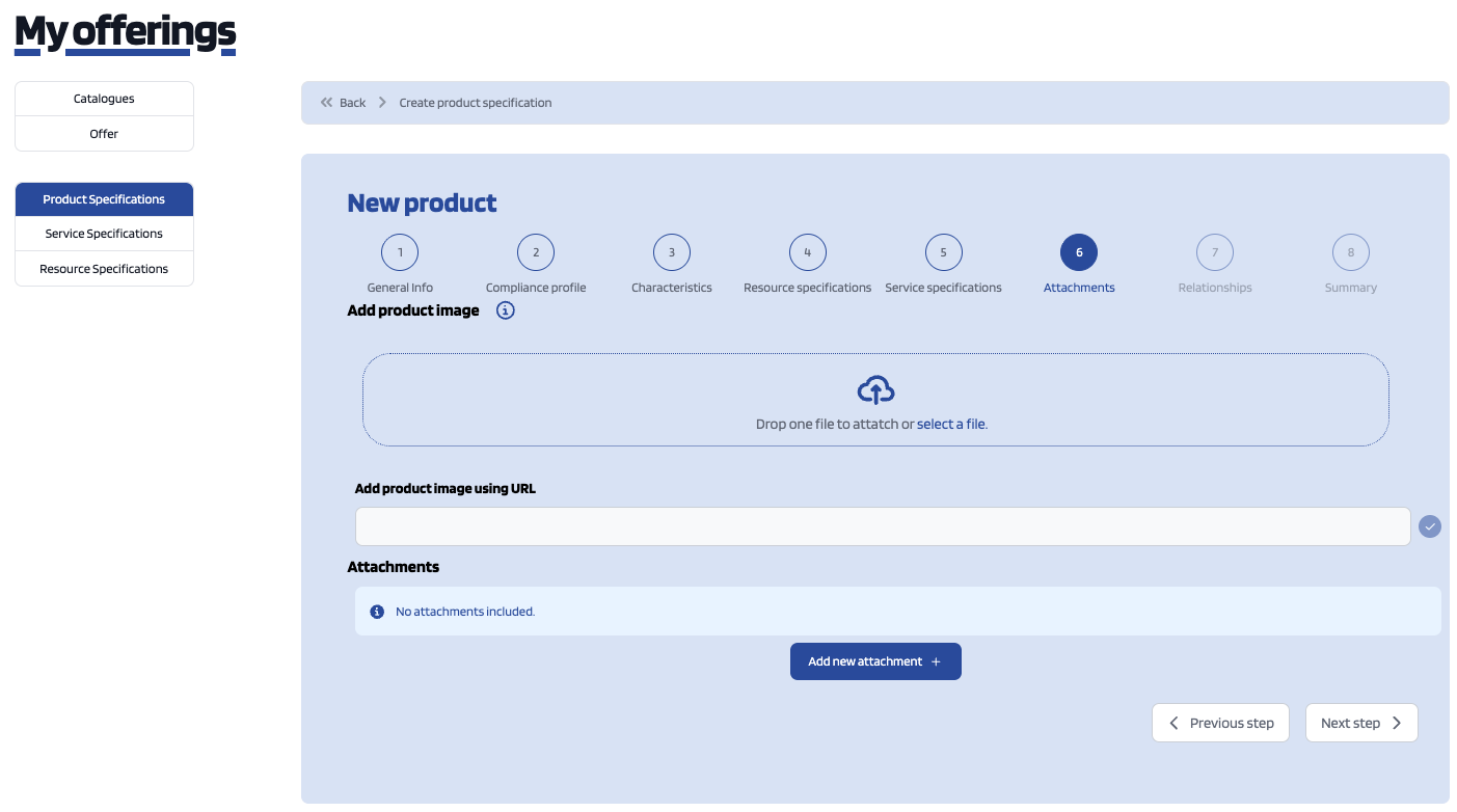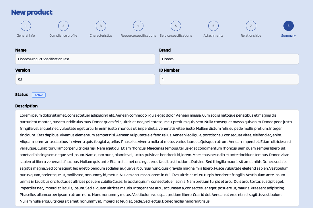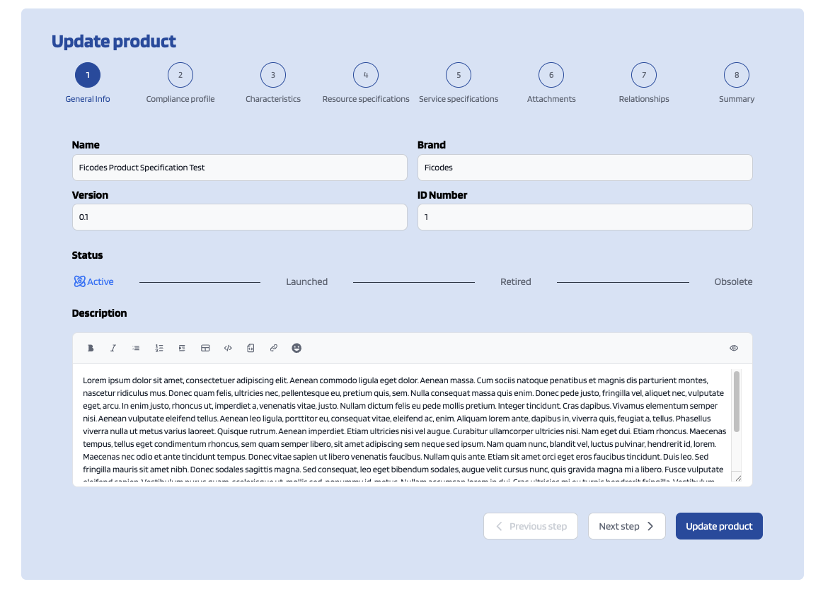 Update the required values, click over Next buttons (or directly on the step that you want to go) and once you've finished click on Update product. Note that for start selling an offering that includes the product specification you will be required to change its status to Launched.