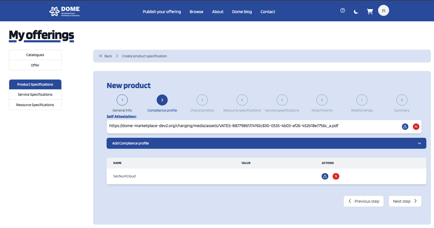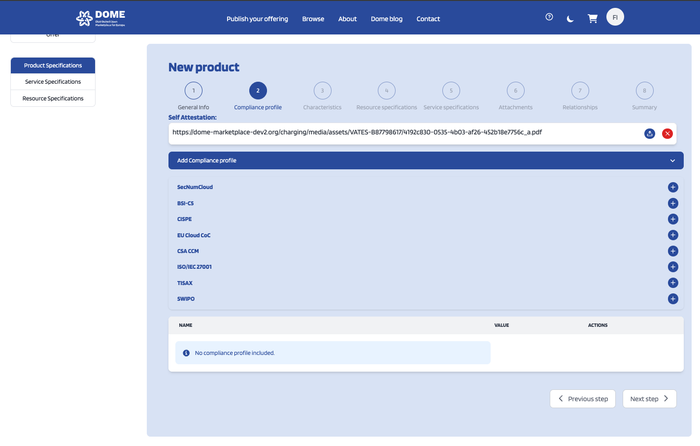 The next step in the creation of a product is including its compliance profile. The first document needed is the "Self attestation" document. This document is required in order to reach the "Basic Level" within the compliance's levels. In order to add this you should click the Upload button right next to the text "Upload your self attestation document".