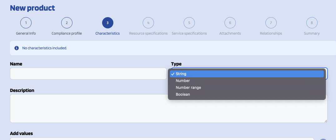 In this form you can select the type of characteristic that you want to create (i.e. String, Number, Number Range or Boolean -used to enable/disable other characteristics-) by clicking on the type dropdown button.