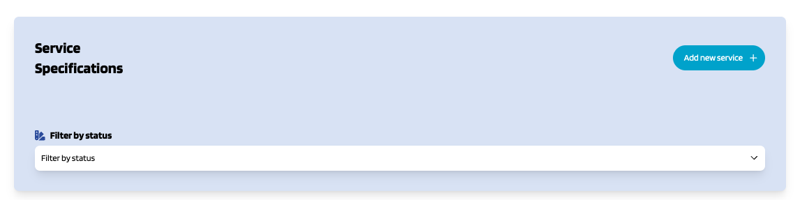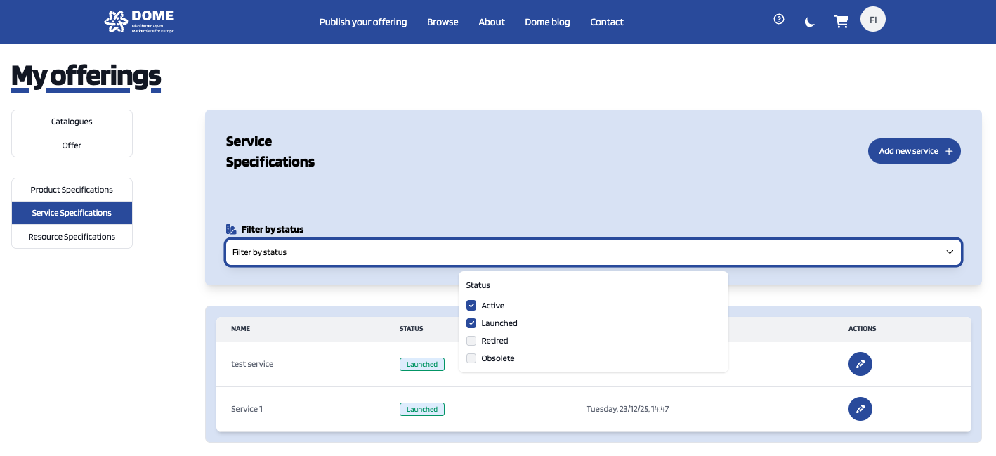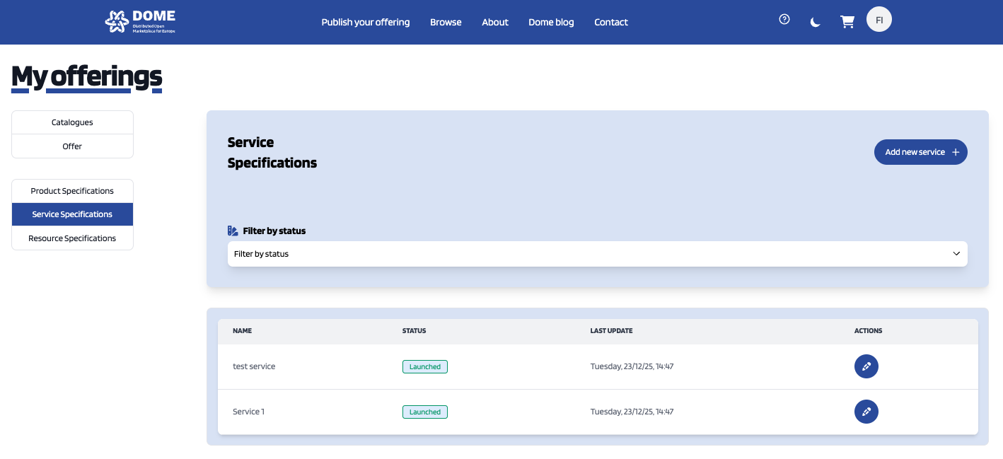 Service Specifications represent the services being offered. To list your service specifications go to My Offerings section and click on Service Specifications.