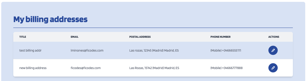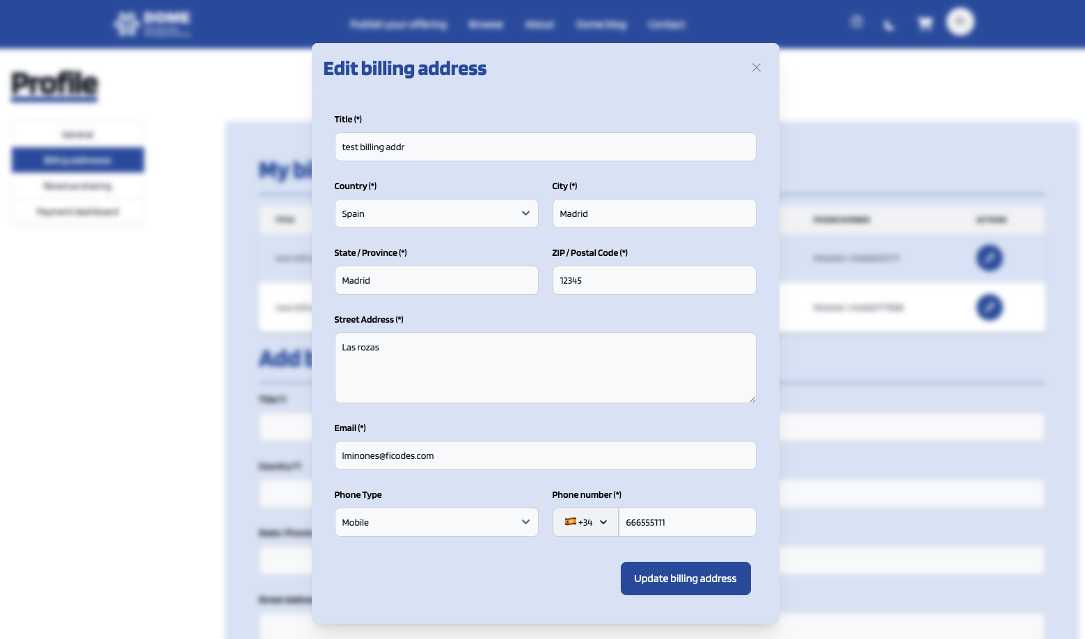 To update a billing address, click the Edit button of the specific address, change the wanted fields and click on Update billing address.