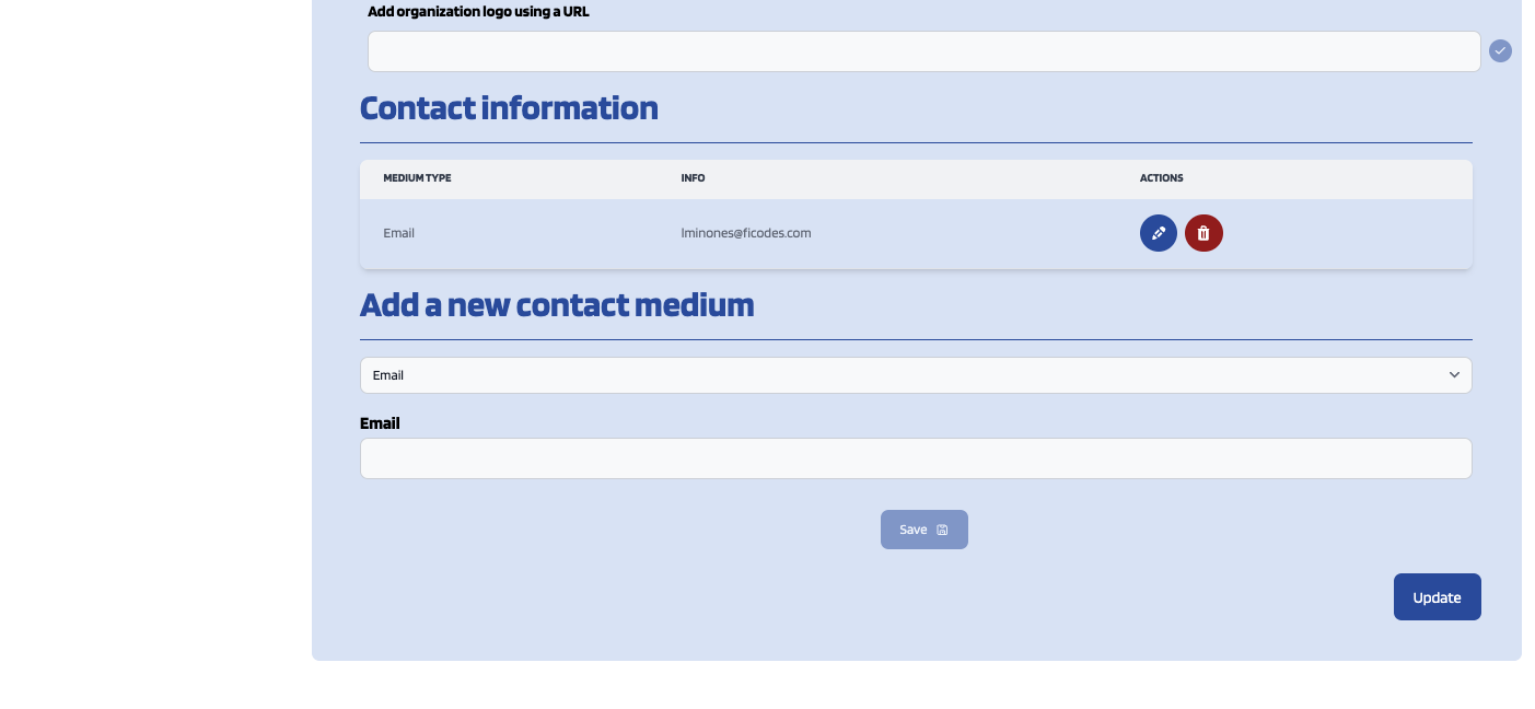 To be more specific about the contact information, this can be created/updated by selecting the medium type (i.e. Email, Postal Address or Phone Number), filling the required fields and clicking on Save. Once you've created as many contact mediums as you need you should click on Update.