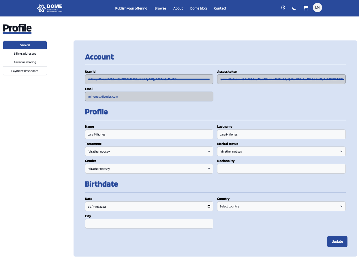 In the displayed view, it can be seen that some information related to the account is already included (Username, Email, Access token). This information is the one provided by the IdM after the login process.