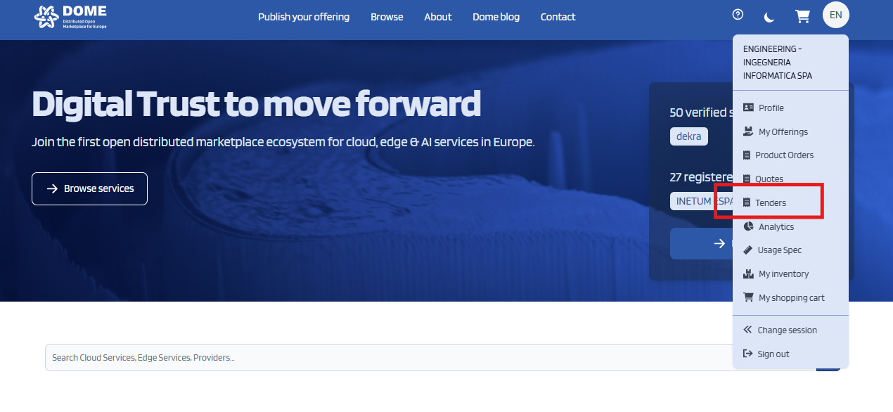 The Tender dashboard is easily accessible at any moment by clicking your profile icon on the top right of the page and clicking on the "Tenders" menu voice